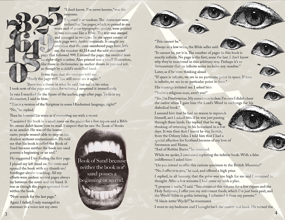 Adobe InDesign 3 page spread of Jorge Luis's story, The Book of Sand